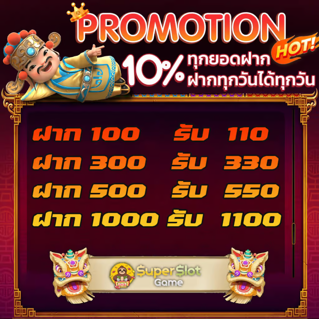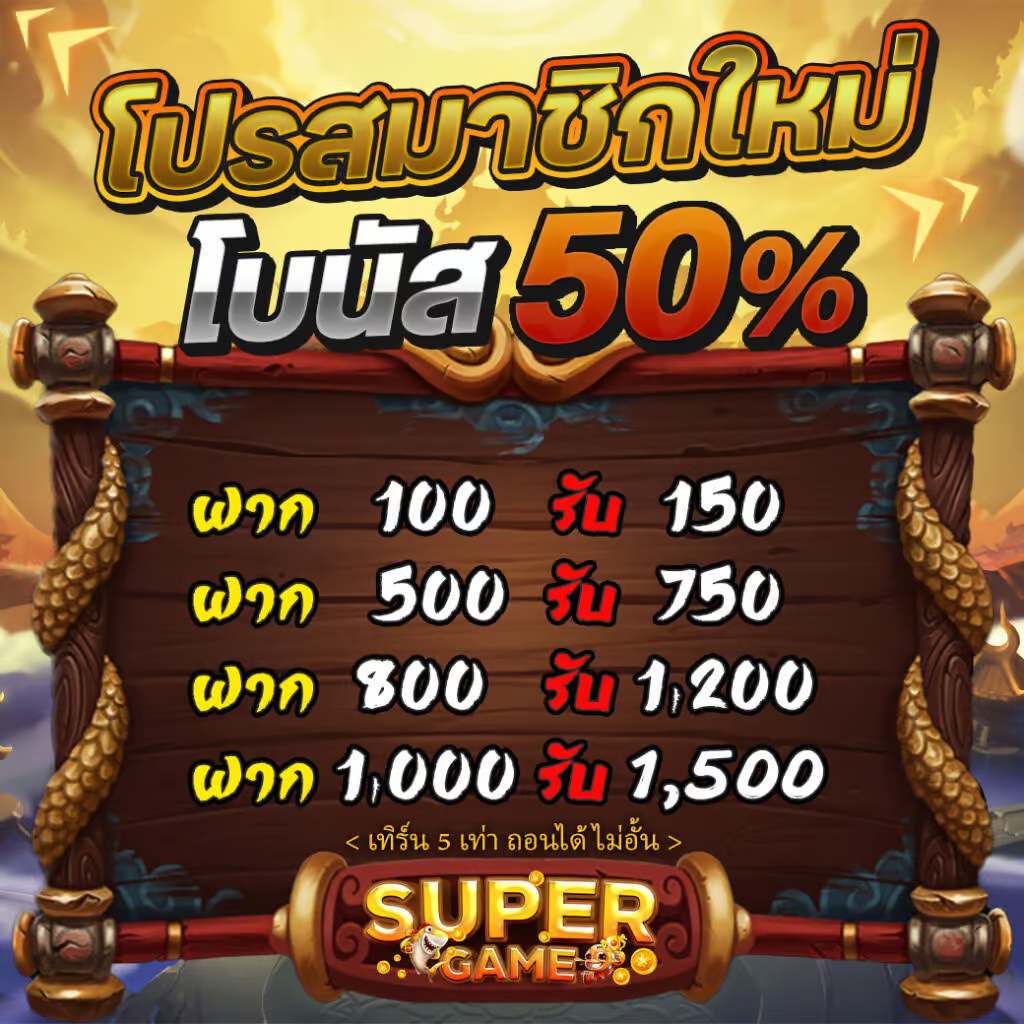เมื่อสมัครสมาชิกใหม่กับ Superslot คุณจะได้รับโบนัสพิเศษถึง 50% ของยอดฝากแรก ตัวอย่างเช่น ถ้าคุณฝากเงิน 1,000 บาท จะได้รับเครดิตเพิ่มอีก 500 บาท รวมเป็น 1,500 บาทเลยทีเดียว ที่สำคัญคือไม่ต้องกังวลเรื่องเงื่อนไขยุ่งยาก เพราะทางเว็บได้ออกแบบเงื่อนไขให้เข้าใจง่ายและเป็นธรรมสำหรับผู้เล่นทุกคน